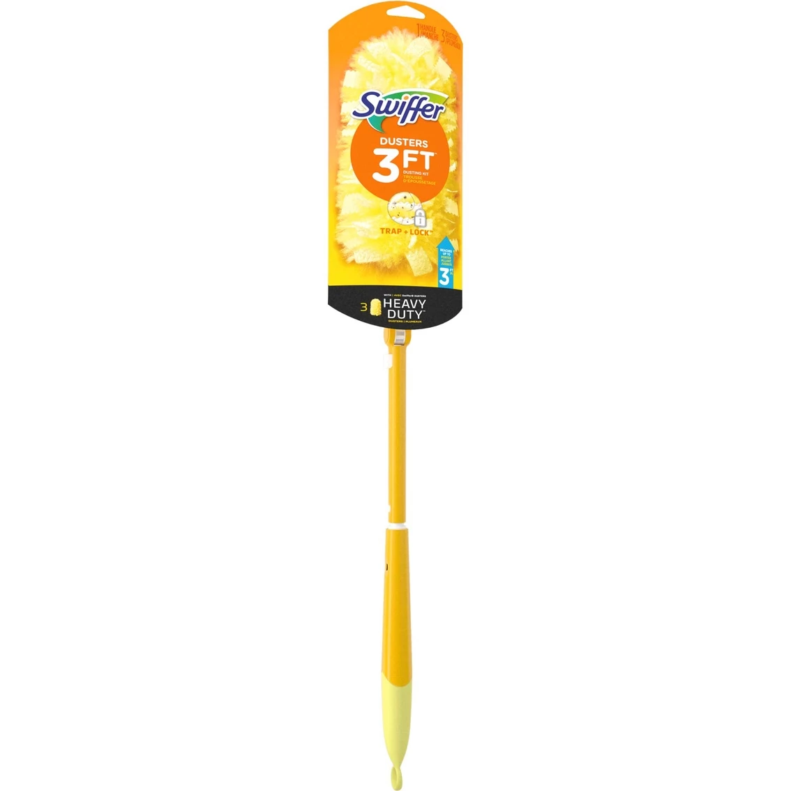 This Swiffer 360 Duster with an Extendable Handle Cleaner Starter Kit traps and locks up to three times more dust than a traditional feather duster. The thousands of fluffy fibers feature Dust Lock Adhesive while the extendable handle extends up to 3 ft. and pivots to clean hard-to-reach places. It is perfect for trapping and locking dust on ceiling fans, wood furniture, baseboards and crown molding. Includes an extendable handle cleaner and 3 unscented dusters.