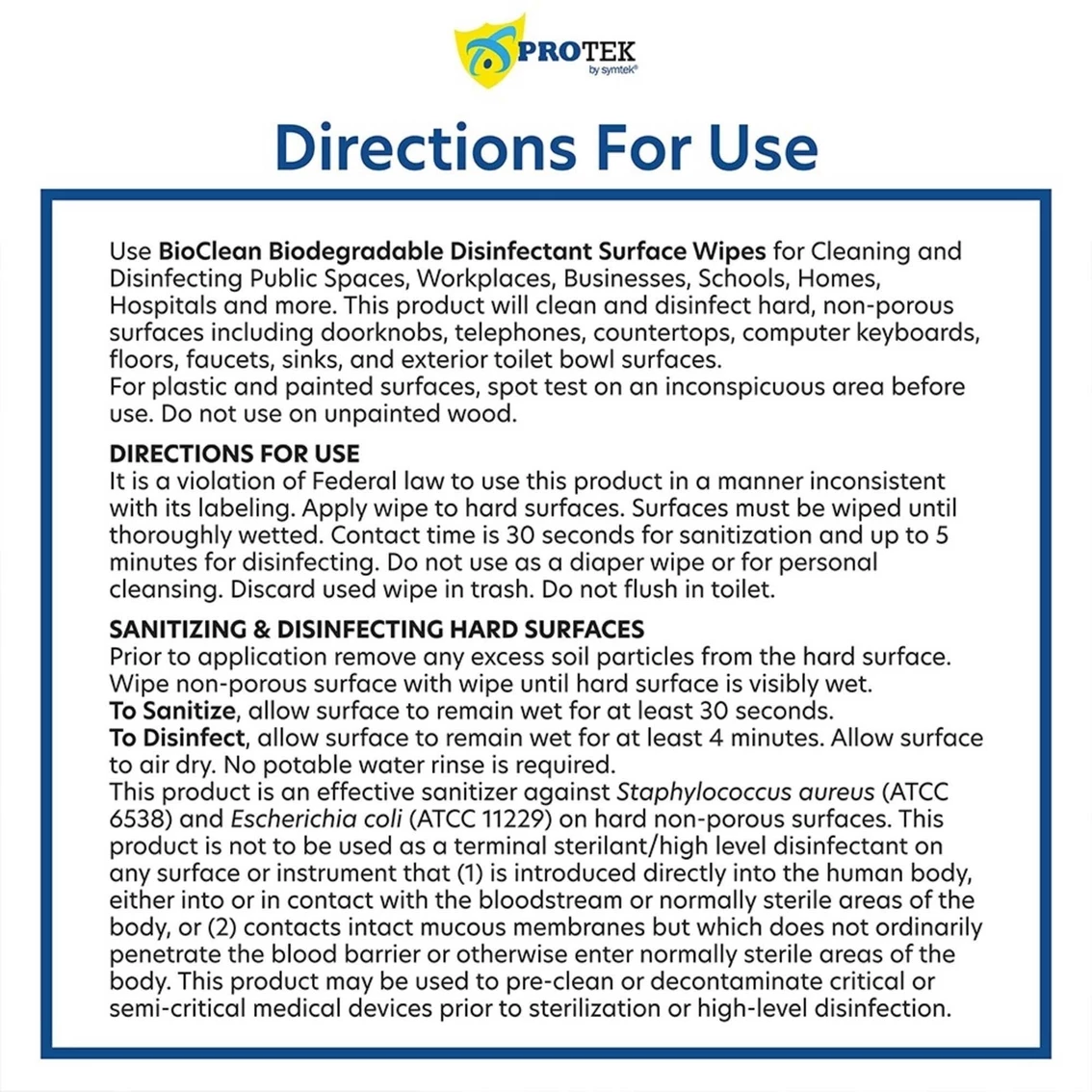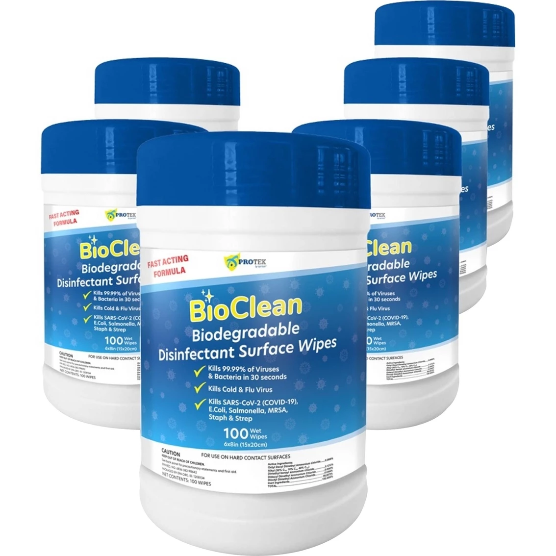 Symtek BioClean Biodegradable Disinfectant Surface Wipes kill 99.99% of bacteria on surfaces when used as directed. Effectively kills Cold and Flu virus, Staph (MRSA) and E. coli, among others. Includes six tubs of 100 large 6 x 8 in. wipes. These disposable, bleach-free and highly absorbent wipes are safe to use on hard surfaces such as plastics, laminates, metals, stainless steel and glass. BioClean wipes are the only EPA List N disinfectant surface wipes that are biodegradable and made in the USA. Compared to traditional synthetic wipes, BioClean wipes are made of natural materials and will decompose up to 86% in 45 days in a landfill. Non-woven wipes take about 100 years to decompose. With BioClean Biodegradable Disinfectant Surface Wipes, you can stay safe while feeling good about doing your part for the environment!